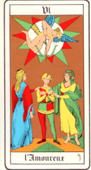 Pour ouvrir ce sujet complexe, je m’appuie aujourd’hui – une fois n’est pas coutume, sur la lame VI du Tarot de Marseille, l’Amoureux.